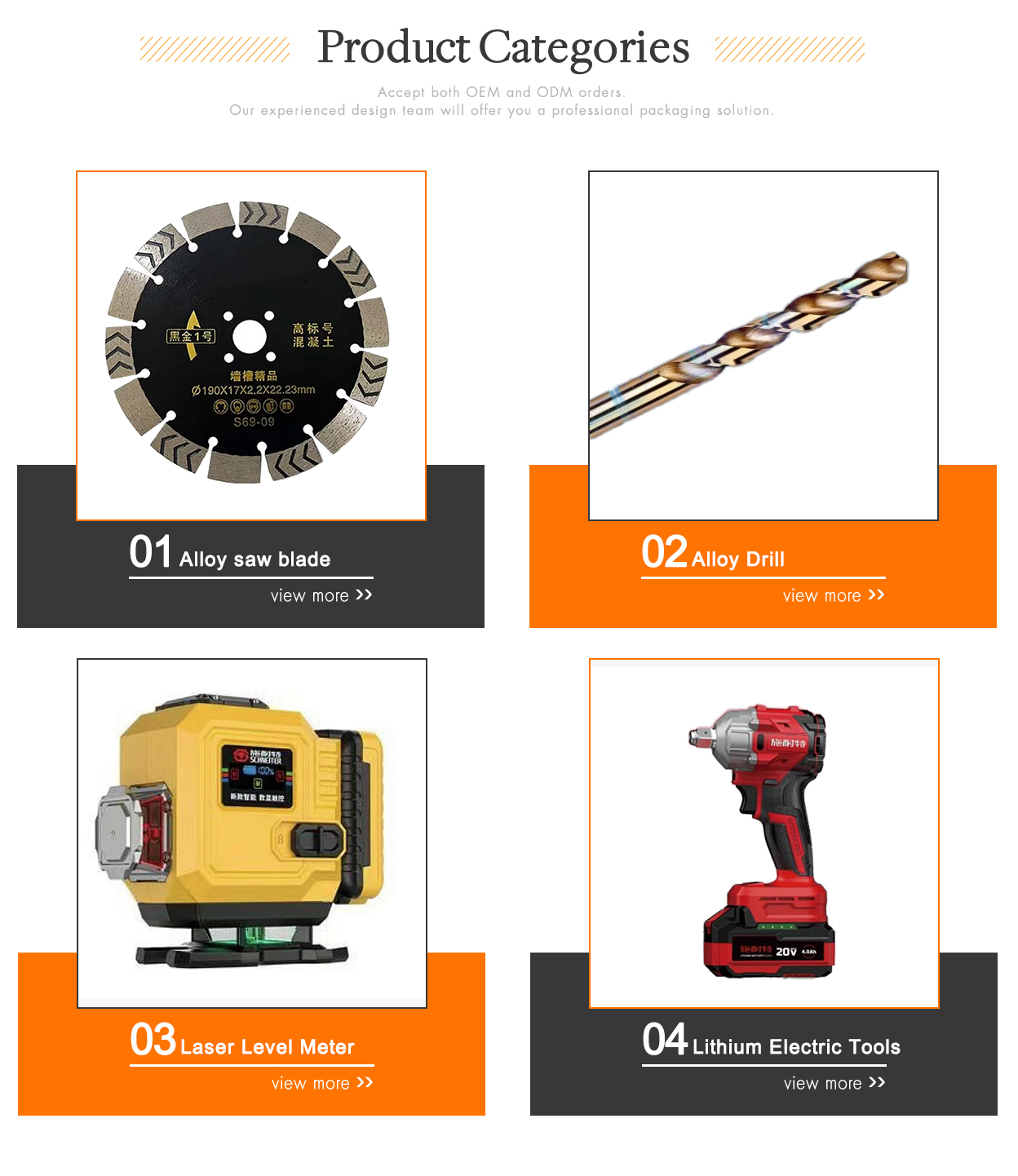 Productos principales:Broca de martillo eléctrico, hoja de sierra de aleación para carpintería, abridor de agujeros para carpintería, hoja de sierra de diamante, taladro helicoidal